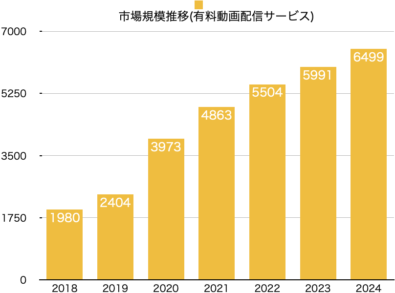 こうした変化を後押しした大きな要因が、動画配信サービスの普及である。国内の動画配信市場は2018年以降、右肩上がりで成長し続けている。以下は2018〜2024年における市場規模の推移を示したグラフである(推計値を含む)。